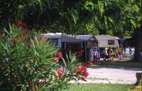 Op een grote staanplaats van 170m² staan 2 stacaravans die een groot terras delen.