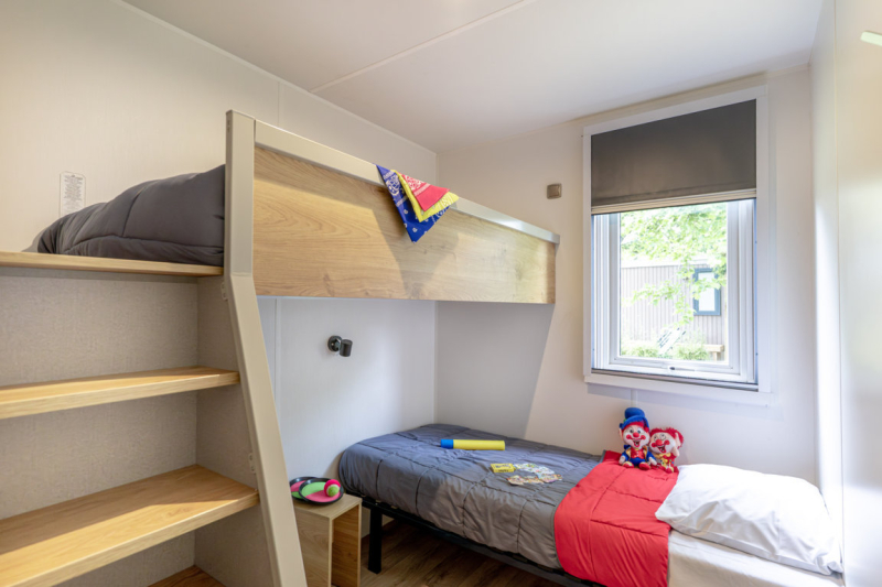 - Of 1 slaapkamer met 2 stapelbedden (4 slaapplaatsen) en een mezzanine in de woonkamer met 1 tweepersoonsbed en 1 eenpersoonsbed