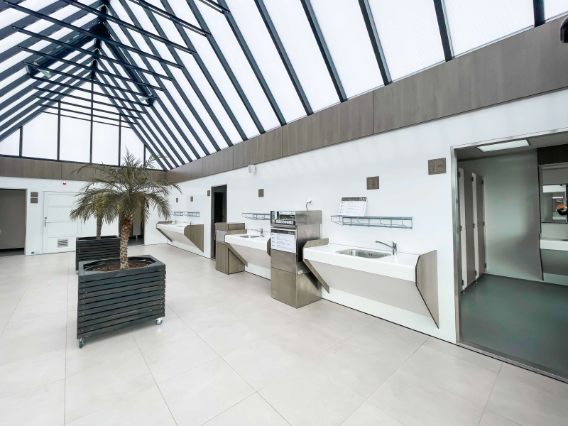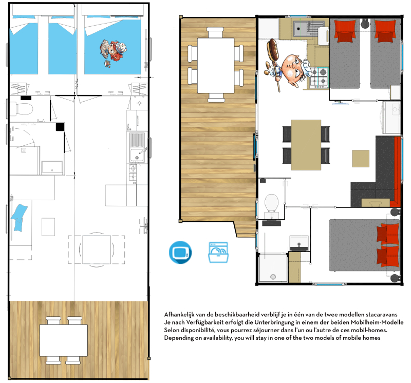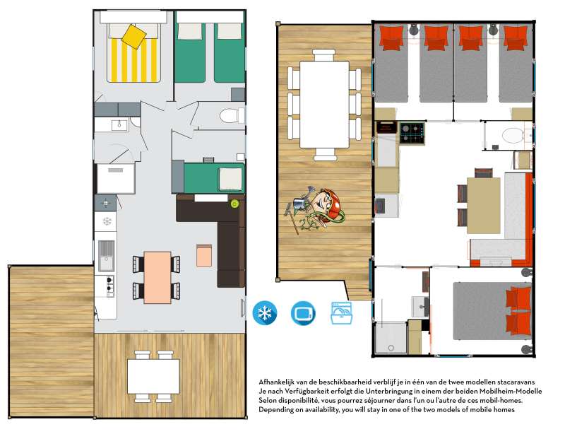 Het is een nieuwe, grote stacaravan voorzien van 2 badkamers en een eigen toilet! Dit concept biedt comfort, rust en leefruimte!