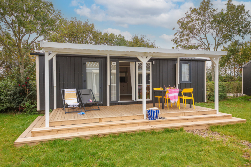 De Jasmijn Top TV 4 stacaravan is uitgerust met een houten verhoogd overdekt terras of met een gelijkvloers stenen terras met aluminium pergola. De pergola heeft schuifpanelen om naar wens in de schaduw of zon te zitten.