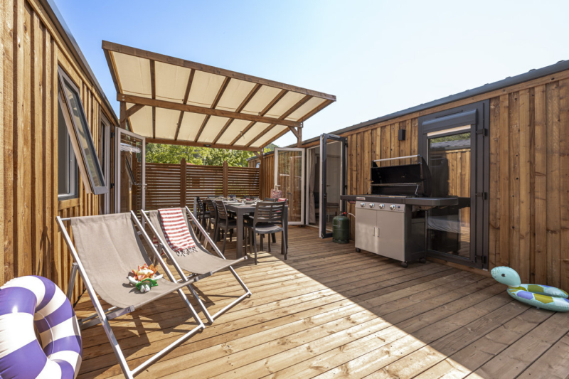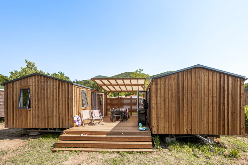 Op een grote staanplaats van 170m² staan 2 stacaravans die een groot terras delen.