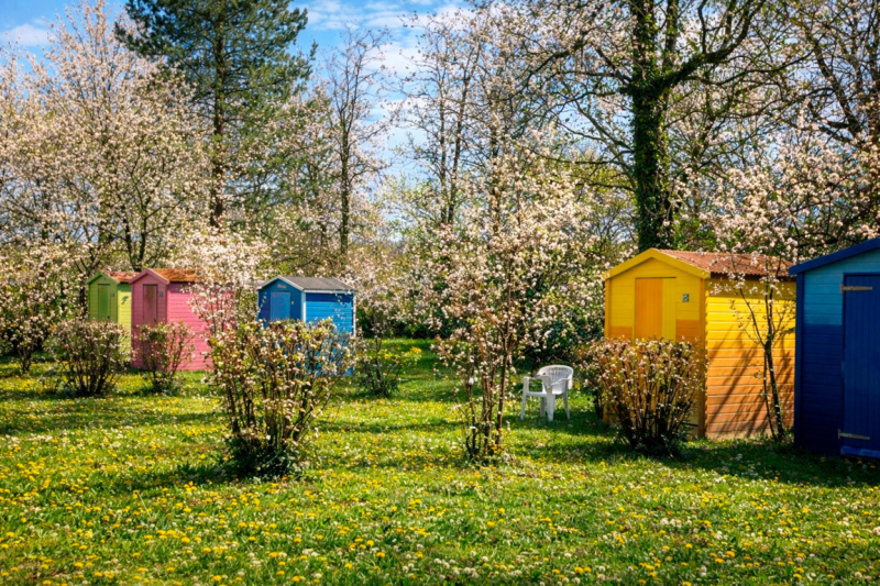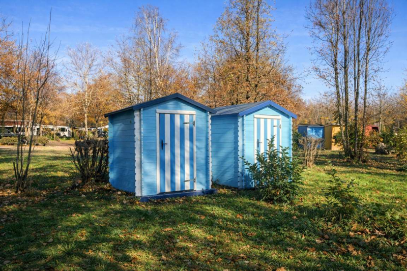 Plaatsen zijn rond de 80m² en beschikken over een privésanitair (douche, wastafel en toilet). Een tuinhuisje met hierin een tafel en stoelen, een grillplaat, twee ligstoelen en een koelkast.