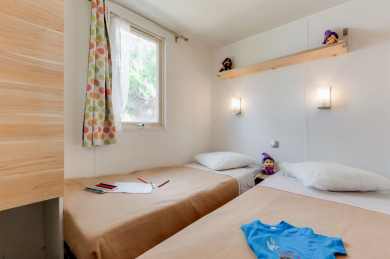 - 2 slaapkamers: 1 tweepersoonsbed en 2 eenpersoonsbedden of een stapelbed