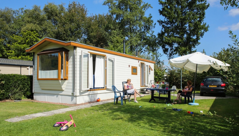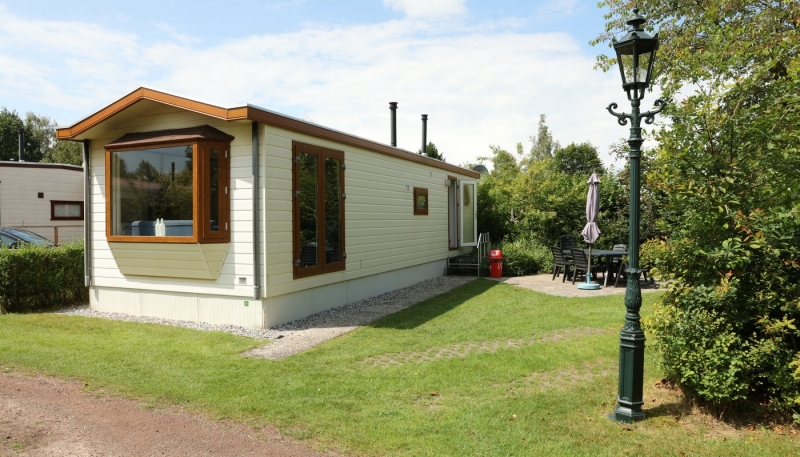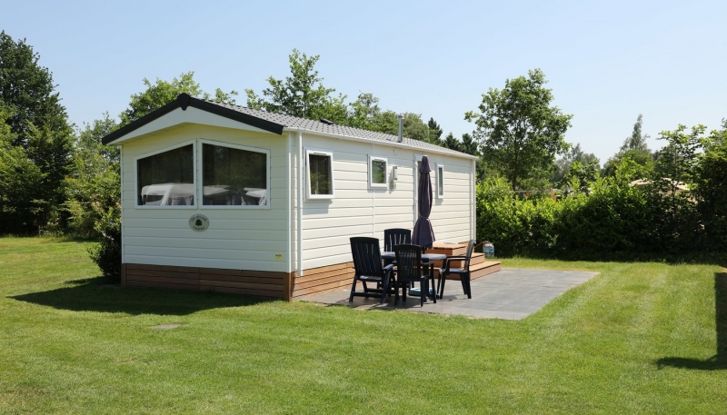 Op een grote staanplaats van 170m² staan 2 stacaravans die een groot terras delen.