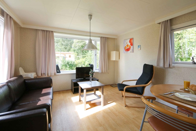 - 1 slaapkamer met 3 slaapplekken (1 verhoogd eenpersoonsbed en een uitschuifbed met twee slaapplaatsen)